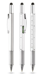 Bolígrafo multifuncional para cada aficionado al bricolaje. El gadget está equipado con dos reglas (centímetros y pulgadas) colocadas en el cuerpo y un pequeño nivel. Bajo la tapa con el bolígrafo táctil se encuentra un destornillador de doble cara fijado con un imán, práctico y cómodo de usar. Marcado posible en el cuerpo.