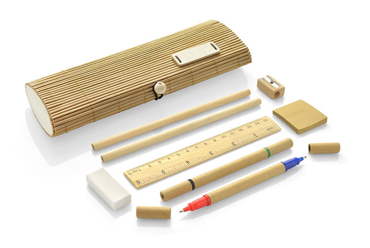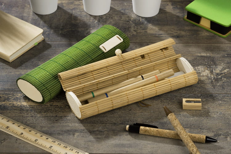 El estuche de bambú con útiles ecológicos es la solución ideal para quienes valoran la armonía con la naturaleza y la funcionalidad. Fabricado con bambú de alta calidad, este elegante estuche combina estética y practicidad. Su color natural beige encaja perfectamente con las tendencias modernas y al mismo tiempo aporta calidez a cualquier escritorio o mochila. Gracias al uso de materiales ecológicos, el uso de este producto contribuye a la protección del medio ambiente, algo sumamente importante en la actualidad.