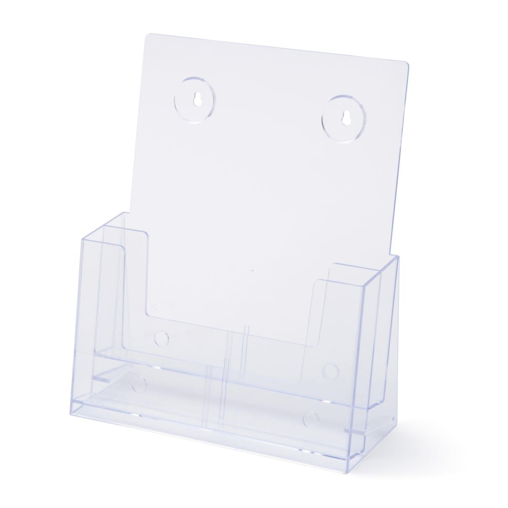 Un expositor de folletos extremadamente práctico y universal en el que puede insertar folletos o prospectos. El expositor de folletos está fabricado en poliestireno transparente de alta calidad. Se realiza por inyección, es decir, moldeado, lo que garantiza un acabado de muy alta calidad y una repetibilidad al 100 % de cada ejemplar del expositor.