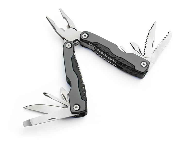 Herramienta multifuncional metálica que incluye todos los elementos necesarios para realizar trabajos básicos. El dispositivo consta de alicates, sierra para madera, dos abridores (para conservas y tapones), lima para madera y metal, destornillador plano, destornillador de cruz y cuchillas con filo liso y dentado. Grabaremos el logo en la superficie de la herramienta.