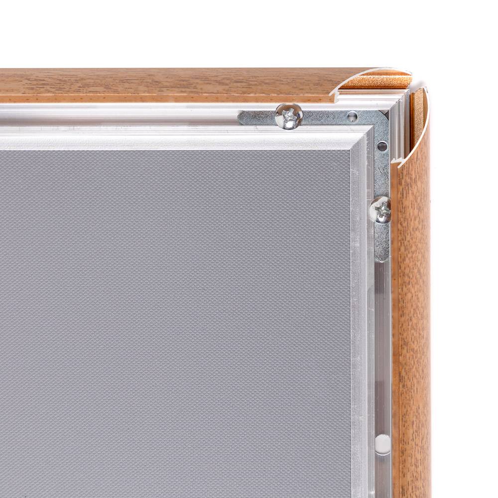 Fabricados con materiales duraderos, los marcos son resistentes a daños y ofrecen un uso prolongado. La estructura sólida de aluminio con un perfil de 25 mm garantiza que sus carteles estarán firmemente sujetos. El vidrio frontal de plexiglás protege sus carteles del polvo, la humedad y daños, asegurando una impresión clara.