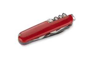 Navaja HIDI con mango de color rojo, hecho de material sintético. Cuenta con todas las funciones necesarias: cuchillo, sierra, raspador para pescado, tijeras, abrelatas, abridor de botellas, destornillador, sacacorchos, punzón y perforador para cuero.