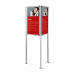 Soporte informativo independiente y resistente a las condiciones atmosféricas con tres paneles informativos de cierre rápido. La estructura del soporte está dispuesta en forma triangular, lo que le proporciona tres lados para presentar contenidos publicitarios o informativos. Los paneles instalados en el soporte son marcos OWZ (abrir - insertar - cerrar), muy fáciles de usar y que facilitan enormemente el cambio de contenido.