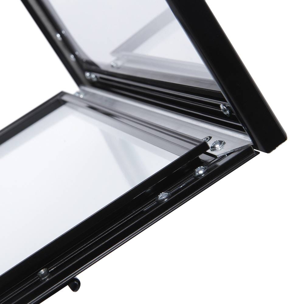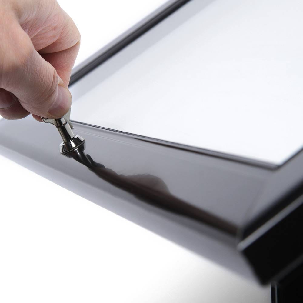 La vitrina para menú con cerradura protege el contenido del acceso de personas no autorizadas. Esta es una solución necesaria y segura en caso de utilizar el soporte en el exterior del edificio.