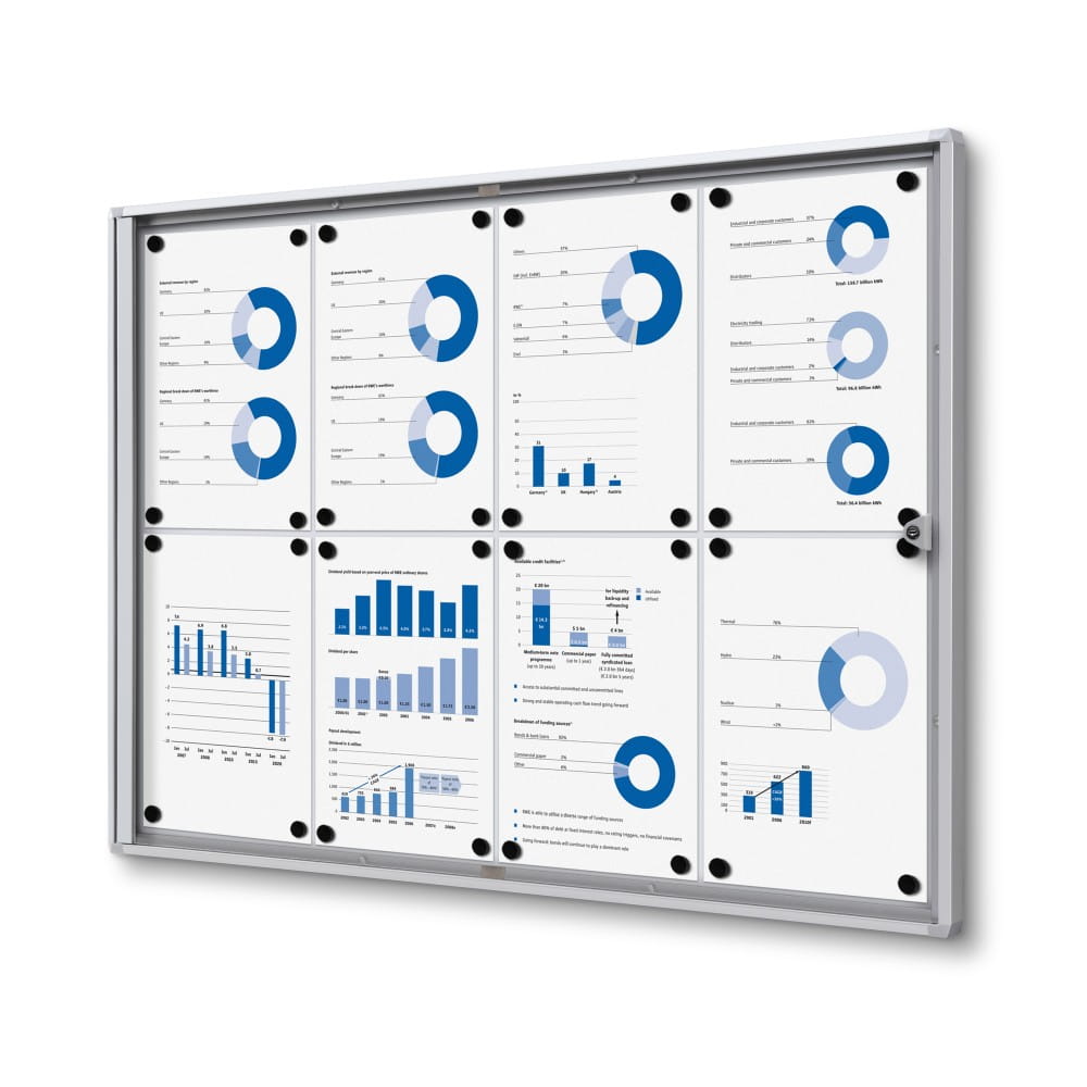 Vitrina magnética cerrada con llave destinada para uso interior, excelente para la presentación de información dentro de edificios. La parte trasera de la vitrina está hecha de chapa, lo que permite colocar la información mediante imanes y además se puede escribir sobre la superficie con marcadores de borrado en seco.